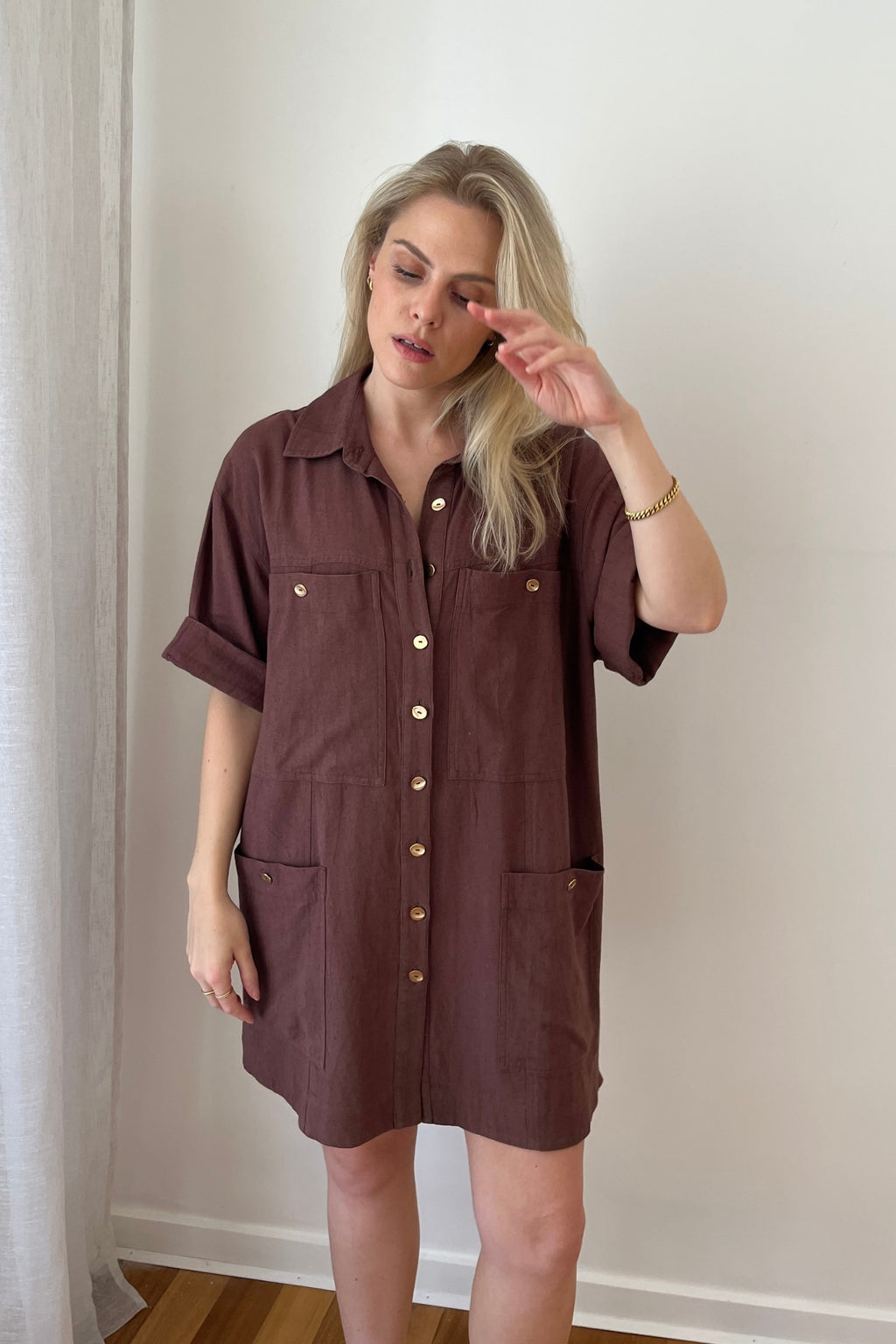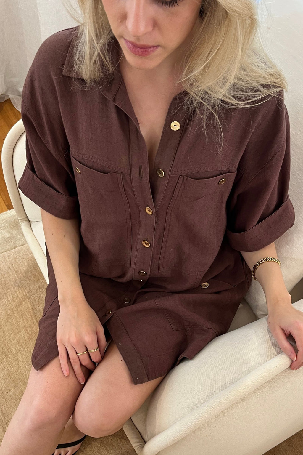 An elevated Summer essential designed to wear anywhere. Crafted from soft feel fabric in this season’s hottest chocolate brown hue. Accented with sculpted gold buttons, pockets and cuffed sleeve details.